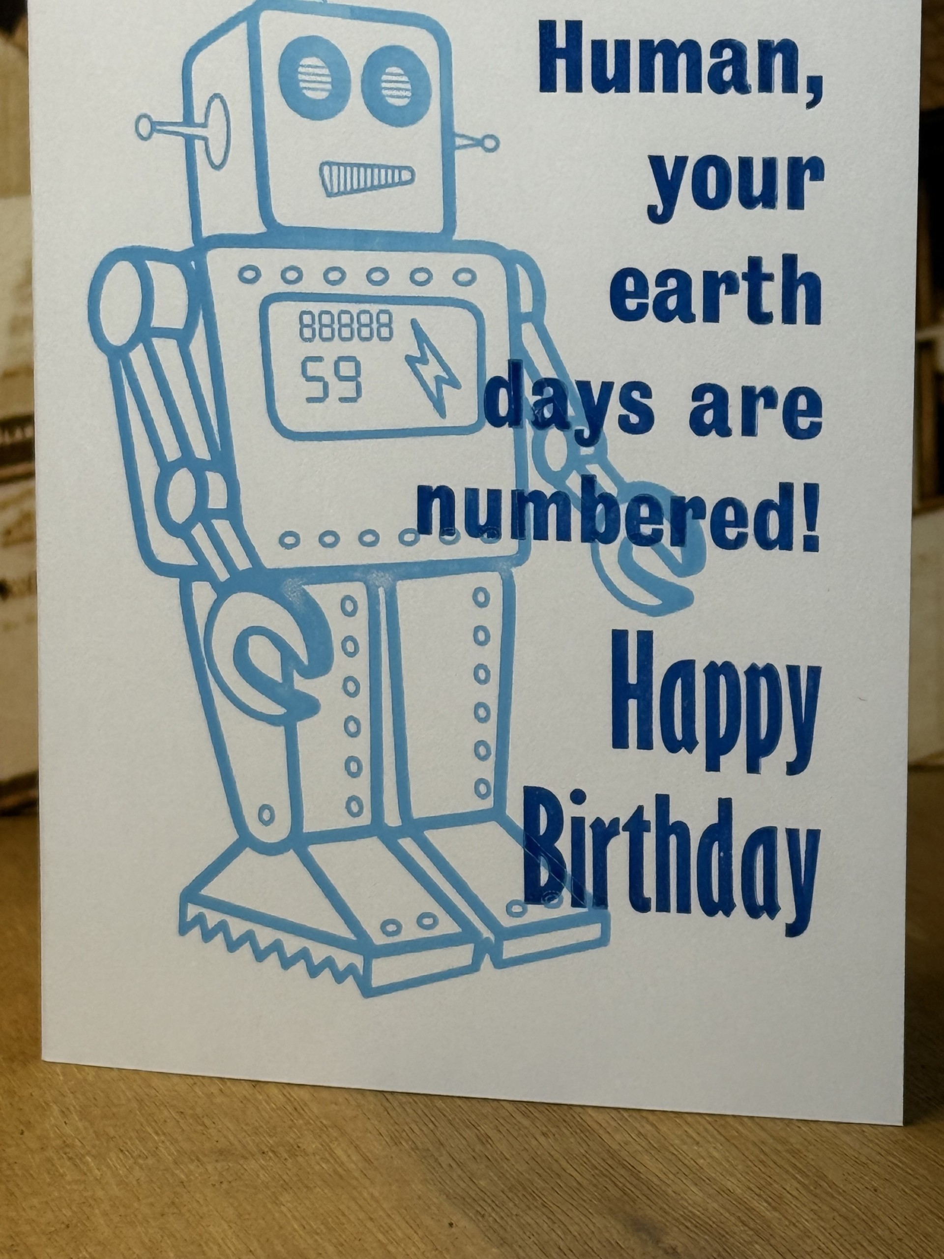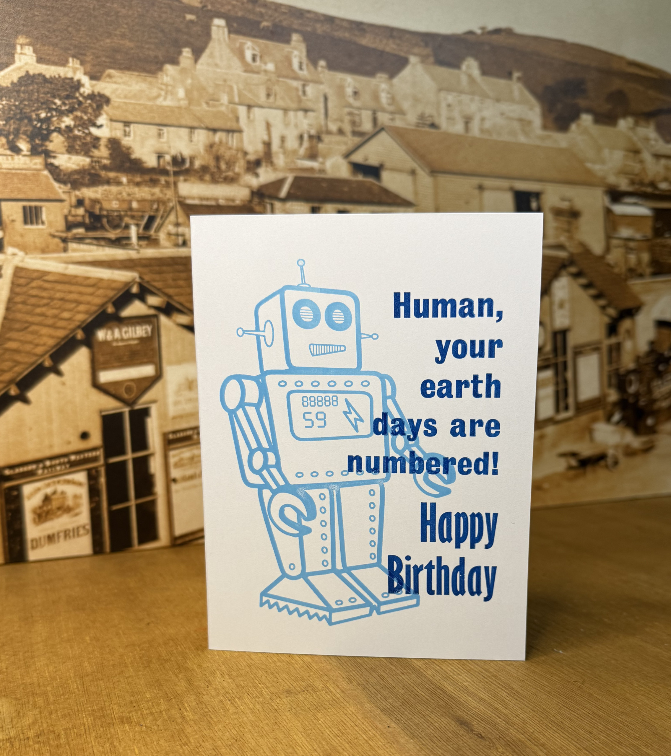 Expertly crafted letterpress birthday card featuring a whimsical robot design. This hand-printed card delivers a clever, tongue-in-cheek message about humanity's numbered days, perfect for the tech enthusiast or sci-fi lover in your life. Printed on premium cardstock with our signature letterpress technique that creates a distinctive tactile impression.